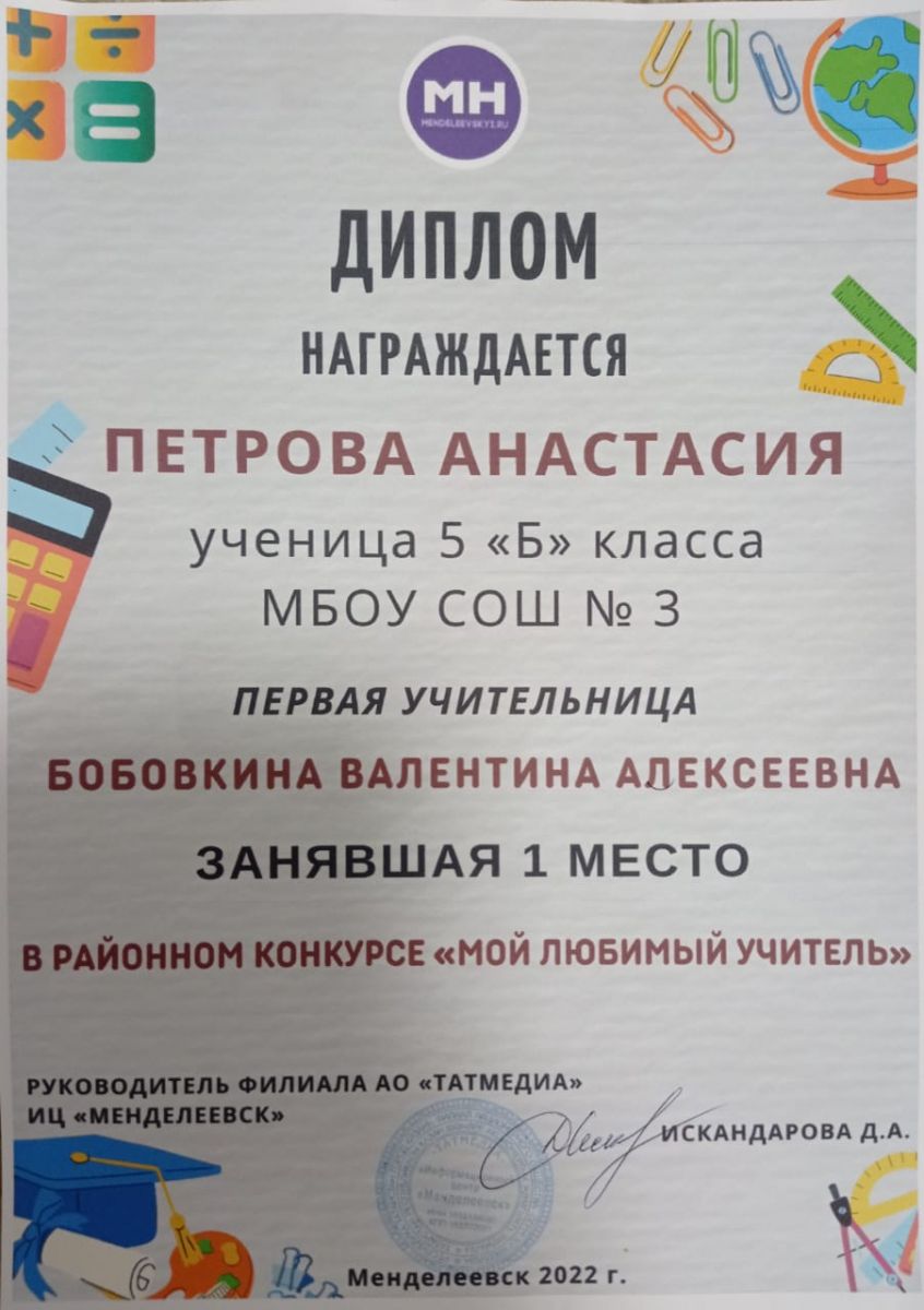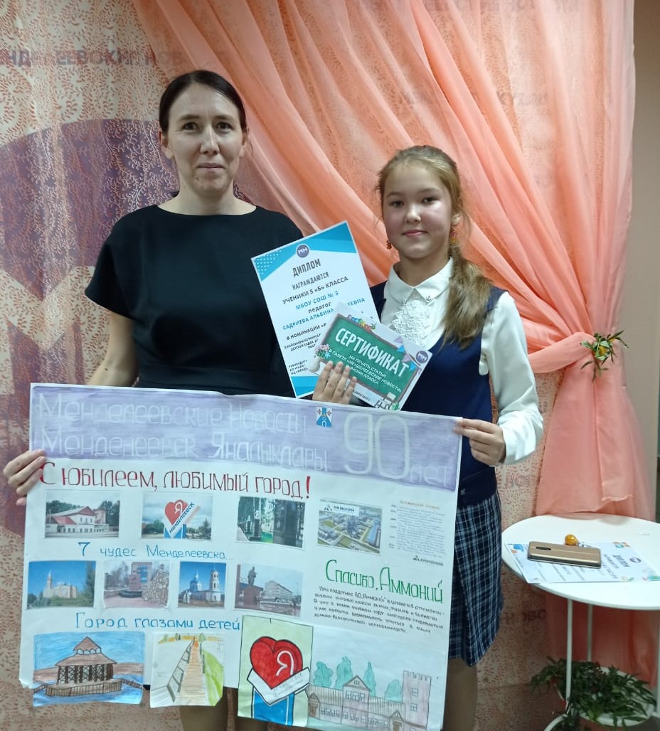 "Менделеевск яңалыклары" редакциясендә "Минем яраткан укытучым" конкурсына йомгак ясалды, шулай ук шәһәр юбилеена багышланган стенд конкурсында катнашкан укытучыларны һәм укучыларны котладылар. Алар арасында безнең 3нче мәктәп укытучылары да бар иде. Конкурста 5Б сыйныф укучысы Петрова Анастасия җиңүче булды. Ул үзенең беренче укытучысын Бобовкина Валентина Алексеевнаны котлады. Шулай ук укытучылар билгеләп үтелде Килеева С. Н., Аликбарова А. Р., Кочергина О. Ю., Заһидуллина Э. Г. Стендлар бәйгесендә катнашкан өчен Садриева А.С. һәм 5Б класс, Н. П. Крестьянинова Н. П. һәм 6А класс бүләкләнде.
