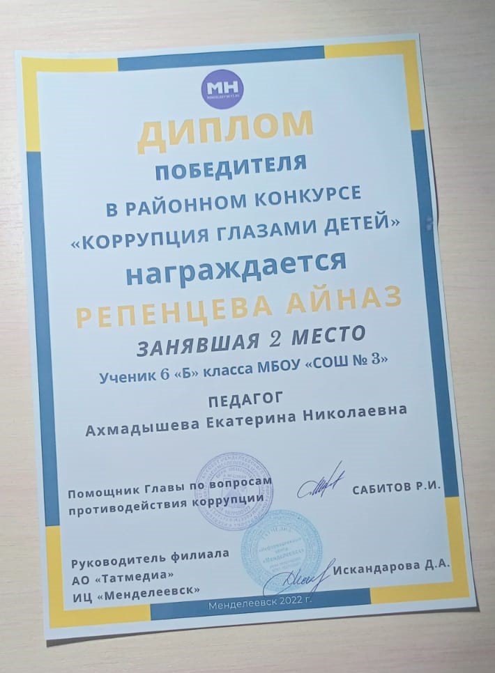 «Менделеевские новости» редакциясе район администрациясе белән берлектә «Мин — Коррупциягә каршы»дигән рәсем конкурсы үткәрде. Безнең укучылар бу конкурста актив катнаштылар. Бүген җиңүчеләрне бүләкләү тантанасы булды, алар арасында безнең укучы Айназ Репенцева да бар иде.