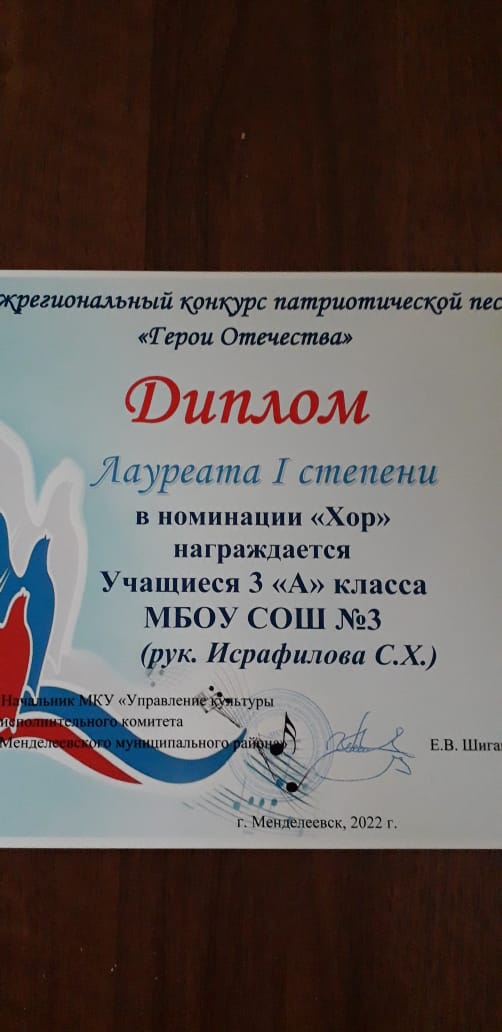 Ватан Герое көне алдыннан Менделеевскида «Ватан Геройлары»дигән район патриотик конкурсы булды. 3А сыйныф укучылары (җитәкчесе Исрафилова С. Х.) "Бабай" җыры белән чыгыш ясадылар һәм 1 дәрәҗә лауреатлар булдылар.