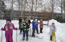 Ученики 1 класса совместно с классным руководителем Аминовой Г.Ф. весело и с пользой для здоровья проводят уроки физической культуры, катаясь на лыжах