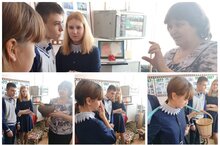 Учитель Гульгена Галиуллина рассказала ребятам о быте татар прошлого века, показала им предметы обихода и объяснила их назначение.Туган тел атналыгы кысаларында 8 һәм 9 сыйныф укучылары мәктәп музеенда булдылар.