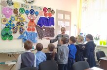 Башлангыч сыйныф укучылары тегү остаханәсенә экскурсиягә киләләр, анда педагог Мөхәммәдиева Э.в. кызларның тегү эше дәресләрендә нинди әйберләр ясаулары турында сөйли. -