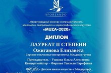 13 апреля ученица ДШИ музыкального отделения Ожиганова Елизавета, приняла участие в Международном конкурсе « Мuza-2020» г. Казань, и стала Лауреатом 2 степени в номинации струнно — смычковые инструменты ( скрипка), преподаватель Ушкова О.А....