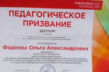 Международный центр научного партнёрства «Новая наука» г.Петрозаводск подвёл итоги II Международного научно-методического конкурса «Педагогическое призвание». Дипломом 1 степени награждена преподаватель Детской школы искусств Фадеева Ольга Александровна в номинации «Дополнительное образование» за свою авторскую исследовательскую работу : «Методика формирования представлений о содержании и значении древних образов и символов в декоративно-прикладном искусстве народов Поволжья».