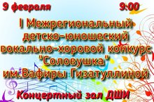 9 февраля в 9:00 в Концертном зале ДШИ, состоится I Межрегиональный детско-юношеский вокально-хоровой конкурс "Соловушка" им.Вафиры Гизатуллиной.
