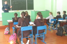 Начальник отдельного поста ГПУ пожарной охраны В.А.Алексеев провел урок пожарной безопасности для учащихся школы .