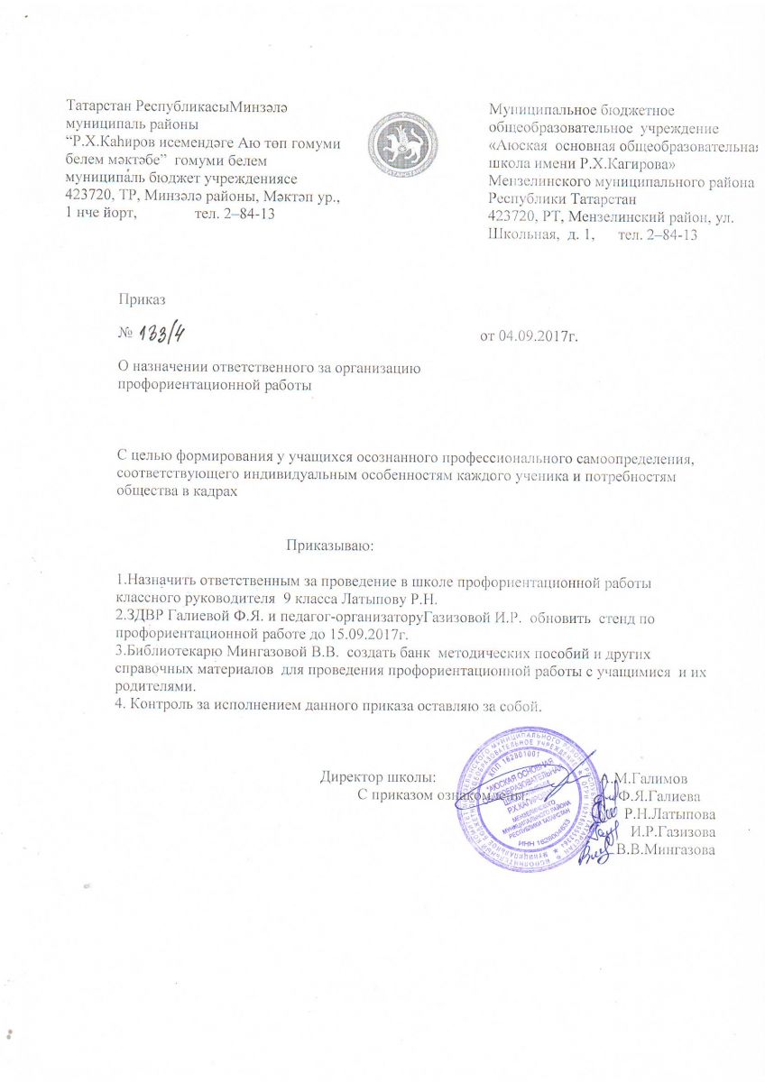 Приказ "О назначении ответственного за организацию профориентационной работы"