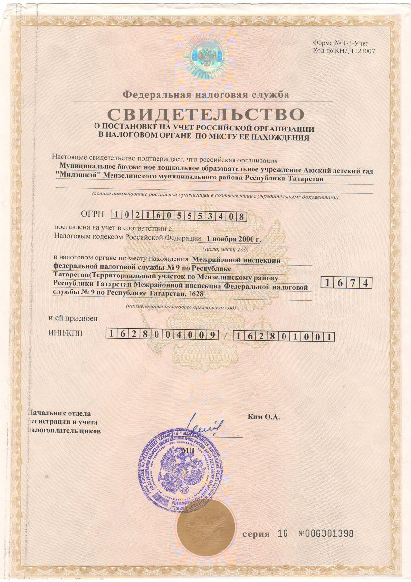 Свидетельство о постановке на учет российской организации в налоговом органе по месту ее нахождения