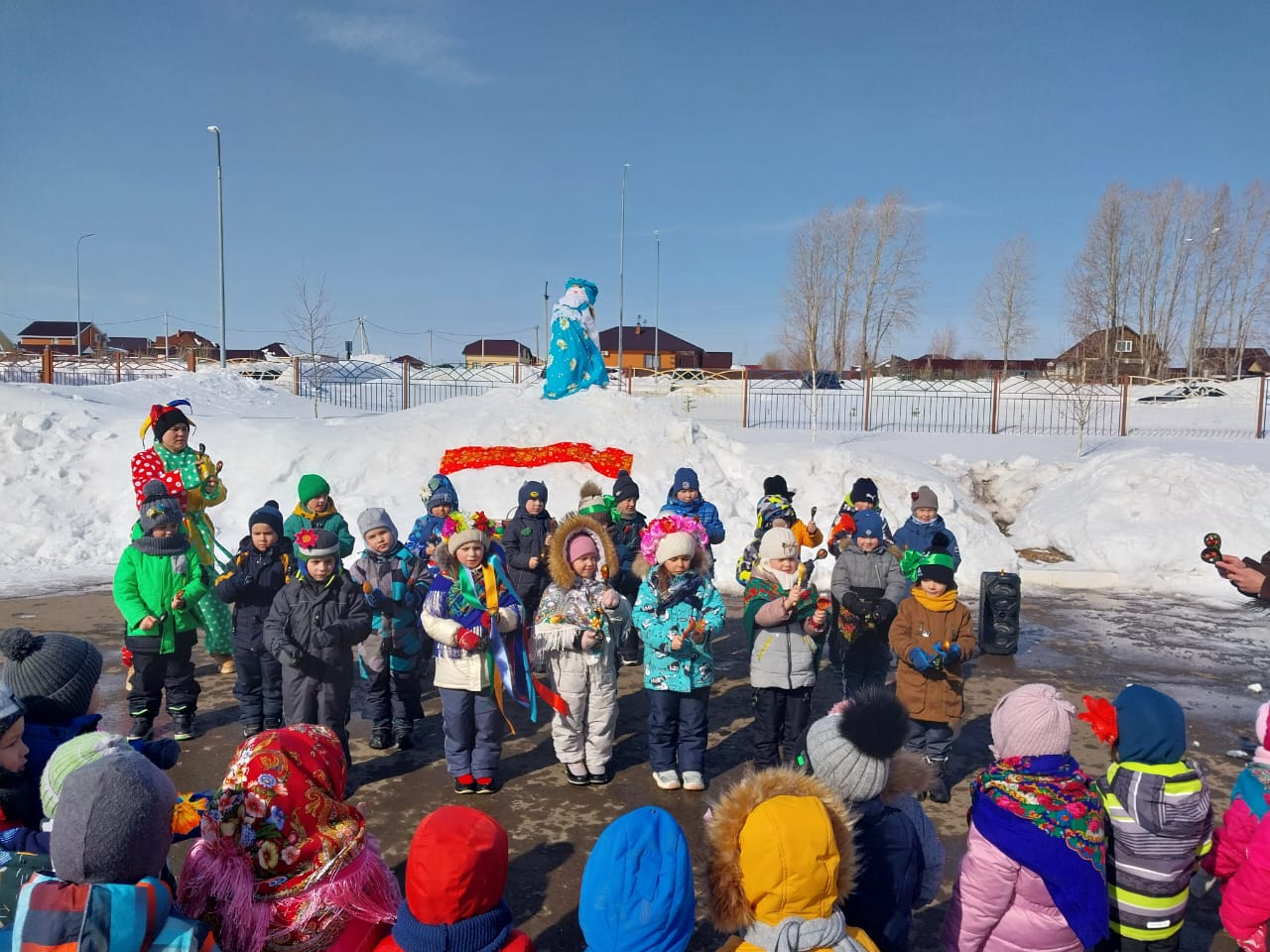 15 марта в нашем детском саду прошло развлечение «Широкая Масленица!» Дети нарядились в яркие расписные платки; украсили себя бусами из сушек и баранок, и отправились на улицу. Зиму провожать, Весну встречать, Масленицу величать.