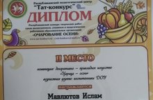 -2 место в номинации декоративно-прикладное искусство "Царица-осень" наргажден воспитанник младшей группы Мавлютов Ислам.