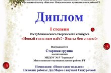 Воспитанники старшей группы стали победителями республиканского творческого конкурса "Новый Год к нам идет!" . На конкурс были отправлены поделки по новогодней тематике, выполненные из природного матеиала