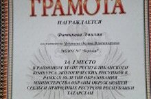 Грамота Фатиховой Эмилии за 1 место в районном этапе Республиканского конкурса экологических рисунков в рамках 30-летия образования Министерства охраны окружающей среды и природных ресурсов Республики Татарстан в номинации "Охраняемые растения животные " "Барс" руководитель Чебашева О.В..