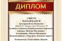 Воспитанник МБДОУ номер 7 "БЕРЕЗКА" Григорьев Игнат принял участие в Республиканском конкурсе рисунков "Веселая Масленица!" и награждён дипломом 3 степени за победу в номинации "Рисуем Масленицу". Руководитель: Хуснутдинова Л.И7 нче "Каенкай" балалар бакчасында тәрбияләнүче Григорьев Игнат "күңелле Масленица! ул "Масленицаны ясыйбыз"номинациясендә җиңгән өчен 3 дәрәҗә диплом белән бүләкләнде. Җитәкчесе: Хөснетдинова Л. И -