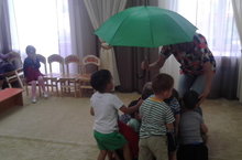 В гости к детям пришел Буратино, который принес сюрприз(Сундучок). Но Буратино по пути потерял ключик от сундука. Дети помогли найти Буратино ключик. В поисках ключа детям приходилось пройти "испытания": они разгадывали загадки, катались на поровозике, прыгали по лужам, делали "Лесную зарядку", играли в игру "Кто быстрее передаст шишки друг другу", "Кто быстрее соберет грибы в корзинку", "Составь цифры по- порядку". В конце развлечения дети нашли ключи от сундука. Сундук открывается- подарки вынимаются!