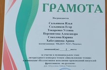 Воспитанники МБДОУ № 10 "Чишма" Сальников Егор, Сальников Илья, Токаренко Устина, Перешитова Александра, Соколова Карина, Хабетдинова Арина под руководством воспитателя Абдуллиной Л.Р. приняли участие в муниципальном этапе международного литературного конкурса "Джалиловские чтения" с постановкой "Вороватый котенок" и заняли 1 место. Поздравляем! Молодцы!