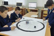 Учащиеся программируют робота, который ездит внутри круга, не выходя за его пределы на уроке дополнительного образования «Robo club».