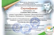 Укучыларыбыз күпсанлы бәйгеләрдә, фәнни-гамәли конференцияләрдә катнашып, үрләр яулый. 7 нче сыйныф укучысы Сәлимова Айназ Габделхак Каюмов исемендәге V Республика фәнни-гамәли конференциясендә катнашып, чыгыш ясады.