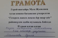 МКУ "отдел образования" совместно с СОШ 3 провели литературно- музыкальный конкурс "Гомерем минем монлы бер жыр иде... ", посвящённый жизни и творчеству поэта- героя Мусы Джалиля. Конкурс проводился среди школьников с целью выявления талантливых детей в области выразительного чтения, пения и театрального искусства. Из нашей школы приняла участие кадет 7 класса А. Маликова (учитель Хамматова Г. Г.) со стихотворением "Яшь ана/" Молодая мать" и награждена дипломом II степени!!!.