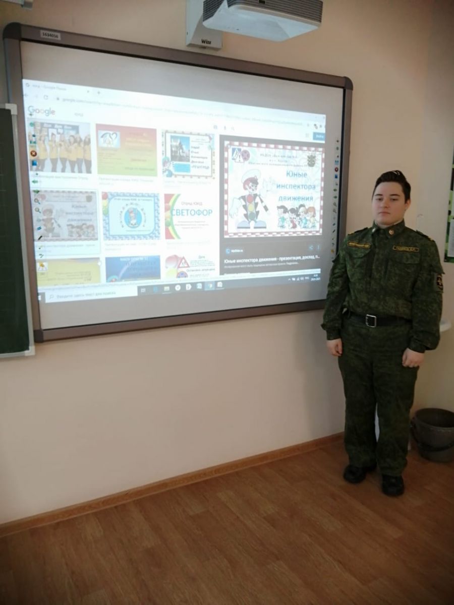 Ученик 8 класса Газизов Ильдар рассказал чем занимаются юные инспектора движения ЮИД. Он попросил своих одноклассников объяснить младшим школьникам, как переходить дорогу, когда они выходят из автобуса. И всегда останавливать малышей, если они переходят в не положенном месте. -