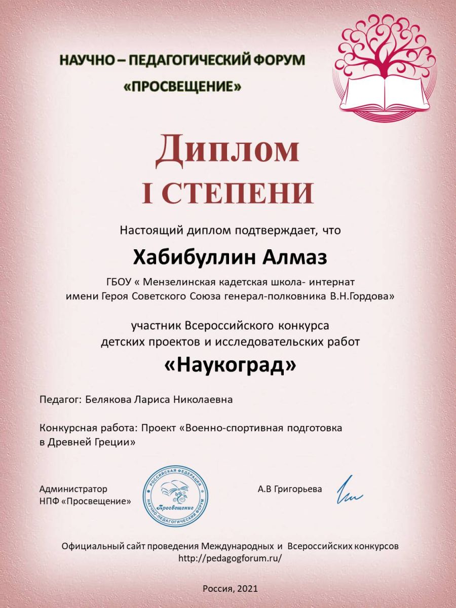 Опубликовано: 25.01.2021Ученик 5 класса Хабибуллин Алмаз принял участие во Всероссийском конкурсе детских проектов и исследовательских работ "Наукоград".