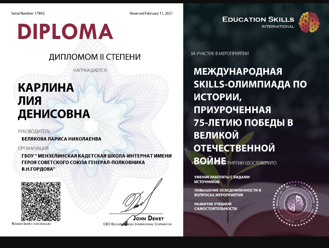 Опубликовано: 16.02.2021Учащиеся 11 кл Карлина Лия и Рязанов Кирилл приняли участие в мероприятиях образовательного центра Education Skills Intemational по праву " Правовой навык " и по истории "75-летию Победы в Великой Отечественной войне". Цель - формирование практических навыков и умений по самостоятельному вхождению в знания.Это международные тенденции развития образования.Материалы создают элементы скиллфолио обучающихся -набора освоенных способов выполнения действий,обеспечиваемый совокупностью приобретённых знаний и навыков.Формирование скиллфолио является требованием времени.