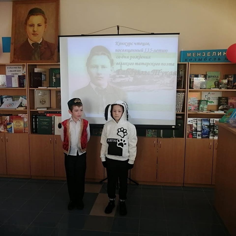 Опубликовано: 24.04.2021В Детской библиотеке имени Р. Гарая состоялся конкурс чтецов, посвященный 135 - летию со дня рождения Г. Тукая. В номинации "Оригинальное исполнение " ученики 2 класса Баженов Савелий и Сомов Данил (учитель Рахманова Ч.М.) награждены грамотами и памятными сувенирами.