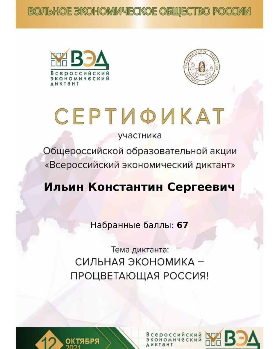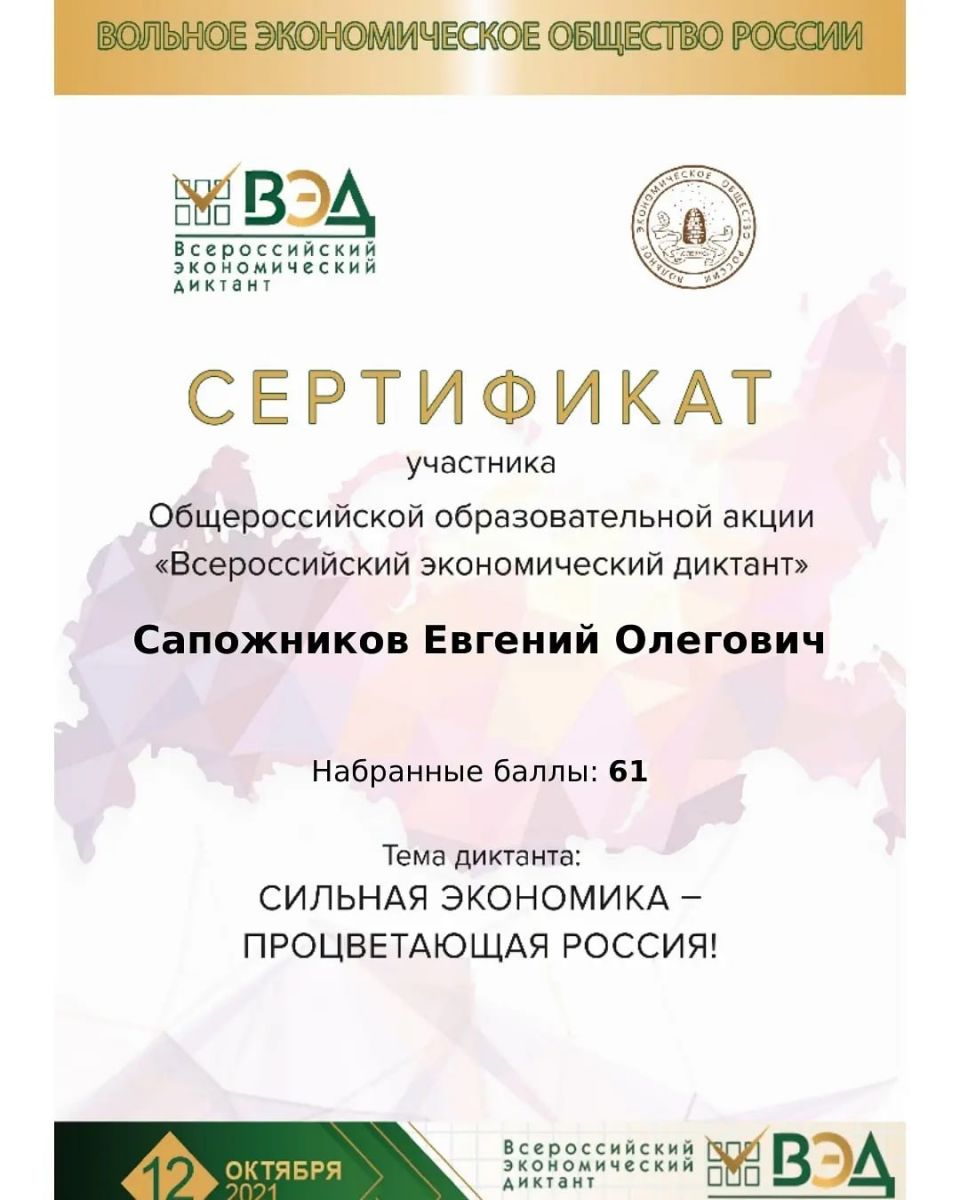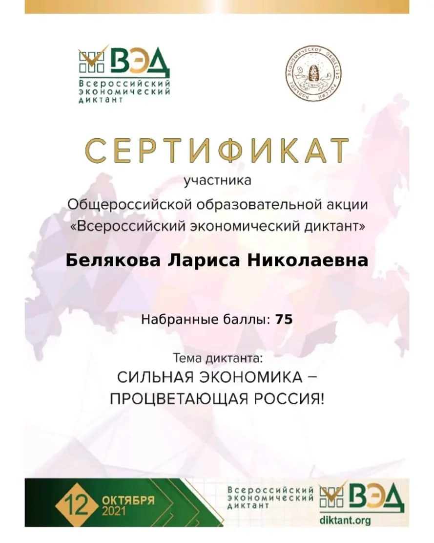 Опубликовано: 12.10.2021В 2021 году Всероссийский экономический диктант состоялся 12 октября онлайн на сайте Всероссийского экономического диктанта в режиме реального времени во всех субъектах Российской Федерации с целью определения и повышения уровня экономической грамотности населения в целом и его отдельных возрастных и профессиональных групп, развития интеллектуального потенциала молодежи, оценки экономической активности и экономической грамотности населения различных субъектов Российской Федерации. В ГБОУ «Мензелинская кадетская школа-интернат» экономический диктант прошли учителя истории и обществознания Анастасьева О.М., Белякова Л.Н. и учащиеся 9, 11 классов. По результатам были награждены сертификатами участника.
