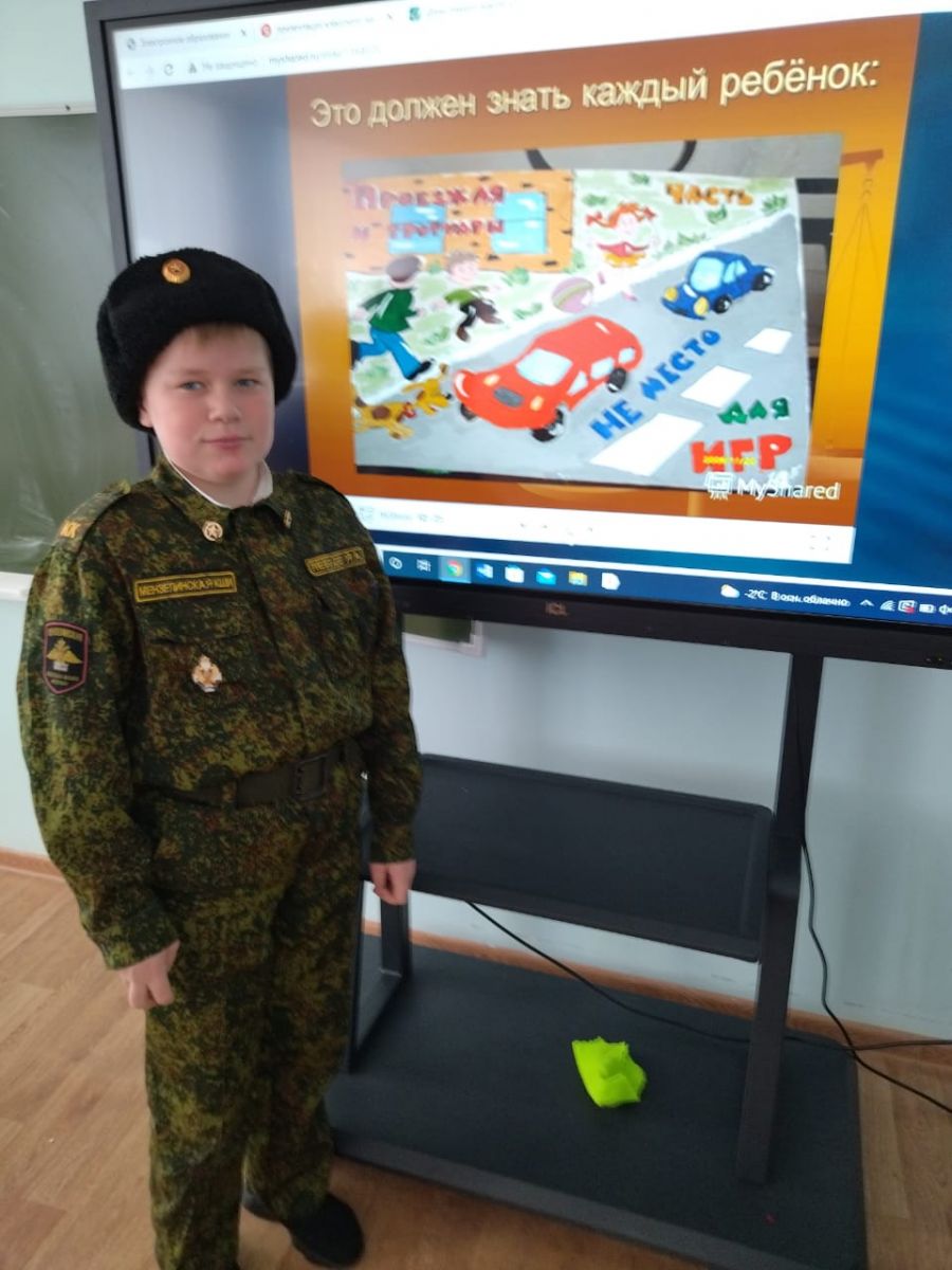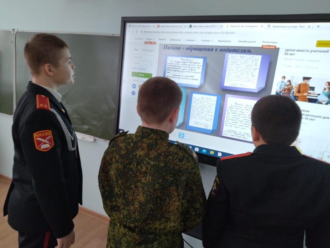 6 нчы сыйныфта "хәрәкәт кагыйдәләре - хөрмәткә лаек" дигән темага сыйныф сәгате үтте. Сыйныф сәгатенең максаты: укучыларның игътибарын юл хәрәкәте куркынычсызлыгы проблемасына җәлеп итү; җәяүлеләр өчен кагыйдәләрне искә төшерү; юл хәрәкәтендә катнашучыларның тормышы һәм тормышы өчен җаваплылык тәрбияләү; юл хәрәкәтендә катнашучы гражданнарның тормышы һәм сәламәтлеге кебек тормыш кыйммәтләре төшенчәләрен тәрбияләү. Кадетлар юл-транспорт һәлакәтләренең сәбәпләре белән таныштылар.