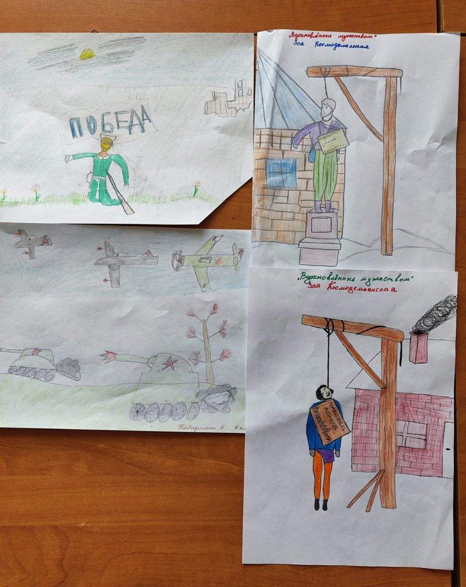 Опубликовано: 13.09.2023Советник директора по воспитанию Валиуллина Л.И.совместно с учителем изобразительного искусства Галеевой Е.И. организовали среди обучающихся занятие,в ходе которого ребятам нужно было через рисунок передать моменты героизма, трагедии и надежды, которые сопровождали тяжелые дни воины. Им было необходимо выразить свое восприятие мужества и стоикости людей,чьи жизни были сокрушены фашистским режимом.