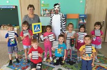 В Детском саду "Солнышко" 24.09.2021 года воспитателями Волковой Л.А, Шаматовой Н.А, Зотовой Э.И было проведено занятие для детей средней - подготовительной группы на тему: "В гости к Зебре". В ходе мероприятия детям давались начальные навыки по безопасности на дорогах. В гости к детям пришла Зебра, которая рассказала как правильно переходить дорогу. Закреплением материала стала аппликация "Зебра" которую дети сделали сами.