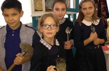 Школьный музей пополняет свои экспонаты. Руководитель кружка "Здесь Родины моей начало" Пучкова В.П. с учащимися приняли в подарок от жительницы села Кукаркиной Т..П. старинную посуду.