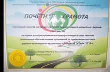 Наш детский коллектив подготовительной группы под руководством воспитателя Шакировой Л.Р. были награждены грамотой за 1 место за участие на первом этапе республиканского смотра -конкурса среди сельских ДОУ по профилактике детского дорожно- транспортного травматизма "Зеленый огонек-2014 год "