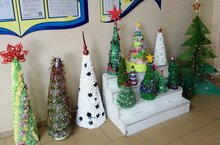 Экологический отряд "Хранители" провели школьный конкурс в защиту леса, предложив сделать ёлки из бросового материала.