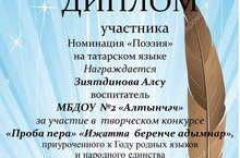 « Алтынчәч» балалар бакчасы тәрбиячесе Зиятдинова Алсу Юныс кызы шигырь, хикәя язучылар өчен район күләмендә узган «Иҗатка беренче адымнар» конкурсында катнаштып диплом белән бүләкләнде.