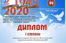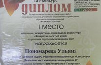 в Республиканском конкурсе творческих работ среди воспитанников, учащихся и пед.работников ОО, посвященных 100-ию ТАССР Диплом 1 место Пономарева Ульяна (руководитель Зиятдинова А.Ю.)"Алтынчәч" 2 балалар бакчасында тәрбияләнүчеләр һәм тәрбиячеләр актив катнашты ОО хезмәткәрләренең тәрбияләнүчеләр, укучылар һәм пед.хезмәткәрләре арасында ТАССРның 100 еллыгына багышланган иҗат эшләре конкурсында 1 урын Пономарева Ульяна 1 урын (җитәкчесе Зыятдинова А.Ю.)