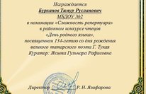 МБДОУ №2 "Алтынчеч" поздравляют воспитанника Бурханова Тимура за активное участие в райнном конкурсе чтецов "День родного языка" посвященном 134-летию со дня рождения великого татарского поэта Г. Тукая.