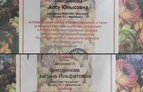 2 “Алтынчәч” балалар бакчасында тәрбияләнүчеләр һәм тәрбиячеләр рус халык һөнәрләре буенча “Жостовские цветы” Бөтенроссия декоратив-гамәли сәнгать конкурсында 1 нче дәрәҗә Диплом Зыятдинова Залина ( җитәкчесе Зыятдинова Алсу Юныс кызы)