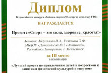 Наш проект: "Спорт - это сила, здоровье, красота!" (авторы: Абдуллаева И.А., Усманова Э.Ф.) награжден дипломом за 3 место в номинации "Лучший проект по привлечению детей и подростков к занятиям по физической культуре и спортом" Министерством спорта Российской Федерации и Министерством образования и науки Российской Федерации. ПОЗДРАВЛЯЕМ!!!
