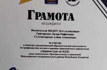 Наши воспитатели, МБДОУ № 6 «Аленушка», Григорьева Л.Р и Султангареева А.А. награждены грамотой за участие в конкурсе ООД по профилактике дорожно- транспортного травматизма «Держим курс на ПДД» среди ДОУ Мензелинского района РТ.