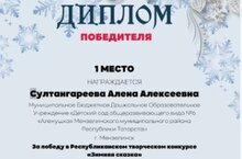 В Республиканском творческом конкурсе "Зимняя сказка" в номинации "Декоративно-прикладное искусство" заняла 1 место. Руководитель:Султангареева А.А.