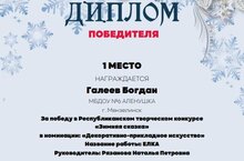 В республиканском конкурсе "Зимняя сказка" в номинации "Декоративно-прикладное искусство" занял 1 место.Руководитель:Рязанова Н.П.