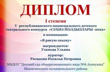В V республиканском национальном детском театральном фестиваль -конкурсе "Сэхнэ йолдызлары-2022" заняла 1 место в номинации "Я рисую сказку".Куратор: Рязанова Н.П.