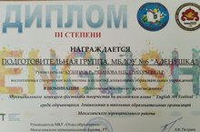 В рамках реализации программы воспитанников и обучающихся Мензелинского муниципального района на 2022-2025 годы "Стремление в будущее " - "Килэчэккэ омтылыш " по модулю «Полилингвальное обучение»,воспитанники подготовительной группы нашего детского сада №6 «Аленушка» приняли участие в фестиваль- конкурсе детского творчества на английском языке «English Art Festival» среди дошкольных образовательных учреждений и были награждены дипломом III степени .Поздравляем! Желаем успехов!!