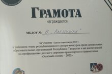 Наш детский сад № 6 «Аленушка» приняли участие в районном этапе республиканского смотра – конкурса среди дошкольных образовательных организации РТ и их воспитателей по профилактике детского дорожно-транспортного травматизма «Зеленый огонек»- 2022» и были награждены грамотой. Поздравляем!