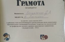 Воспитатель Бондаренко Д.А. приняла участие в районном этапе республиканского смотра – конкурса среди дошкольных образовательных организации РТ и их воспитателей по профилактике детского дорожно-транспортного травматизма «Зеленый огонек»- 2022» и была награждена грамотой. Поздравляем!