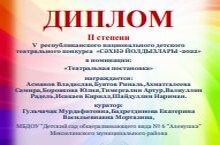 В V республиканском национальном детском театральном фестиваль -конкурсе "Сәхнә йолдызлары -2022" среди воспитанников доу заняли 2 место в номинации "Театральная постановка".Кураторы:Бадретдинова Е.В. и Мортазина Г.М.