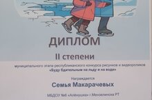 В республиканском конкурсе рисунков и видеороликов «Буду бдительным на льду и на воде» среди воспитанников ДОУ в номинации "Видеоролики" , семья Макарычевых заняла II место. Поздравляем! Желаем дальнейших успехов!