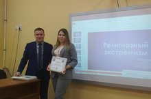 В рамках месячника по противодействию экстремизма и терроризма студентка 104 группы Ермилова выступила с докладом на антитерростическую тему : « Терроризму – нет», которая проходила на базе педагогического колледжа имени Мусы Джалиля среди студентов ССУЗов города Мензелинска и была удостоена сертификата участника.