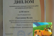 Балалар hәм әти –әниләр белән берлектә авыл хуҗалыгы хезмәткәрләре көненә багышланган “Оранжевая коровка” муниципаль конкурсында катнашып, 3 нче урынга ия булдык.