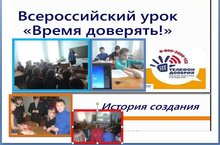 11 сентября 2015 года в рамках Всероссийской акции «Время доверять» в целях повышения узнаваемости номера телефона доверия 8-800-2000-122, а также повышения уровня доверия среди детей и подростков к детскому телефону, доверия как услуге экстренной психологической помощи, классными руководителями 1-9 классов был организован единый урок «Время доверять», посвящённый 5-летию работы Всероссийского детского телефона доверия с элементами тренинговой и игровой работы. Школьникам ещё раз напомнили о возможностях детского телефона. В конце урока все ответили на вопросы анкеты . Учащиеся с интересом прослушали историю возникновения телефона доверия.Посмотрели видео ролики на тему "Пункт приема детских страхов."